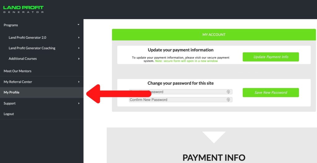 Click the menu option on the left side of your screen labeled “My Profile” to access your payment information and reset your password.